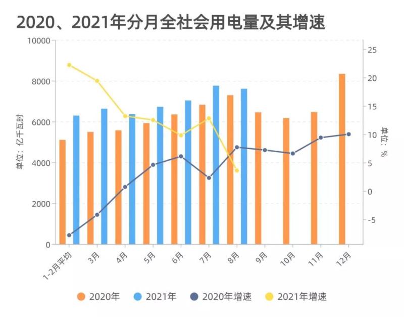 國家能源局?jǐn)?shù)據(jù)顯示,2021年以來,全社會(huì)用電量增速總體呈下降態(tài)勢(shì)。2021年1-8月,用電量分月增速分別為22.2%(1-2月平均)、19.4%、13.2%、12.5%、9.8%、12.8%、3.6%。