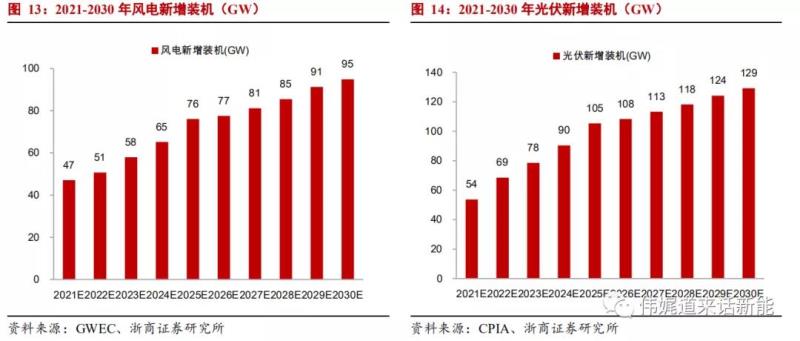 我們認(rèn)為在雙碳政策支持、產(chǎn)業(yè)經(jīng)濟(jì)性突出的背景下,2030年全國非化石能源消費占一次能源比例有望達(dá)到28%,測算“十四五”期間風(fēng)電和光伏以及儲能將分別實現(xiàn)年均新增裝機(jī)59GW、79GW以及22.6GWh。
