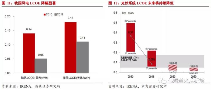 風(fēng)電方面,根據(jù)IRENA 統(tǒng)計,截止 2019 年,我國陸/海風(fēng)的 LCOE 已經(jīng)由 2010 年的 0.14/0.18 美元/kWh下降到了 0.05/0.11 美元/kWh,降幅分別為 66%和 37%。另外根據(jù)今年 6 月發(fā)改委發(fā)布的《關(guān)于 2021 年新能源上網(wǎng)電價政策有關(guān)事項的通知》,我國新核準(zhǔn)的陸風(fēng)項目平價上網(wǎng),海風(fēng)項目也有望在十四五期間實現(xiàn)平價。光伏方面,當(dāng)前國內(nèi)光伏項目 LCOE 已降至0.25-0.35 元/kWh,基本實現(xiàn)平價;全球光伏 2018 年 LCOE 均值為 0.085 美元/kWh,且據(jù)IRENA 預(yù)測,未來全球光伏 LCOE 仍有 30-50%降本空間。