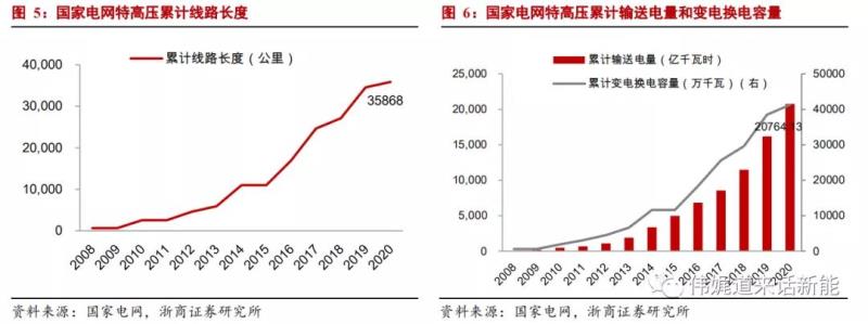 特高壓項目確實有效促進(jìn)了新能源外送。2020 年特高壓工程在運在建線路長度達(dá)到3.59 萬千米,變電(換流)容量達(dá)到 4.1 億千瓦,特高壓電網(wǎng)累計輸送電量超過了 2.1 萬億千瓦時,2020 年當(dāng)年輸送電量 4567 億度,占當(dāng)年國網(wǎng)供電量的 10%。