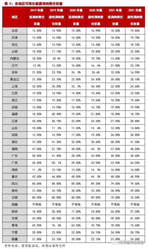 消納責(zé)任權(quán)重成為平價后國家規(guī)劃風(fēng)光等驅(qū)動可再生能源裝機(jī)的核心手段。目前我國光伏和陸上風(fēng)電已經(jīng)實現(xiàn)平價,海上風(fēng)電平價也有望在十四五期間實現(xiàn)平價。通過下發(fā)各地可再生能源消納責(zé)任權(quán)重目標(biāo),各地區(qū)新增風(fēng)光機(jī)組不再由國家能源局統(tǒng)一規(guī)劃,而是通過消納權(quán)重的執(zhí)行來實現(xiàn)。各地能夠通過國家給出的發(fā)電量和消納權(quán)重測算出2021 年各類可再生能源應(yīng)該達(dá)到的發(fā)電量,從而進(jìn)行裝機(jī)規(guī)劃。此外,文件中公布的最低權(quán)重只是可再生能源的裝機(jī)下限,考慮到文件中還具備激勵性權(quán)重,有余力的地方有望超額完成目標(biāo),從而提高風(fēng)光裝機(jī)增量。