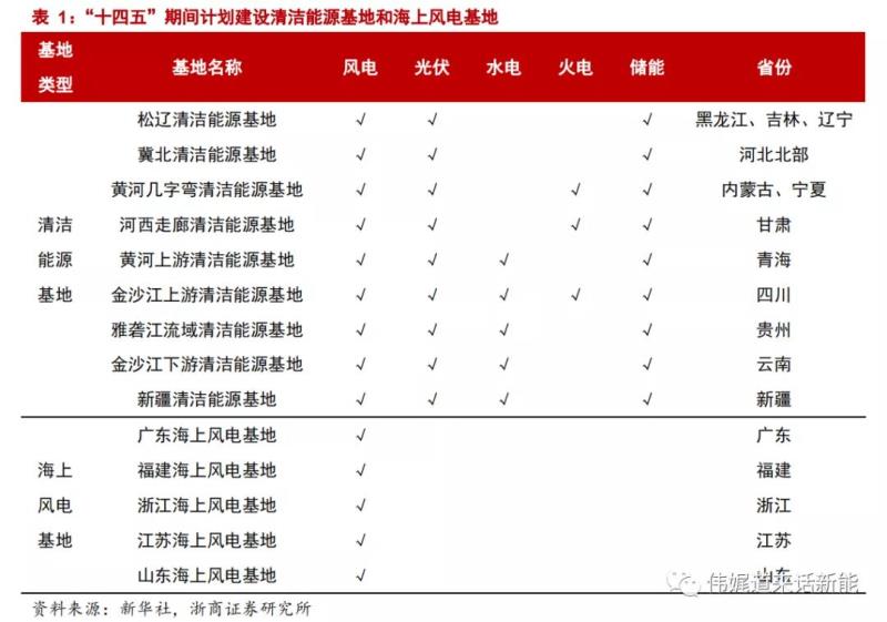 根據(jù)新華社公布的《中華人民共和國國民經(jīng)濟(jì)和社會發(fā)展第十四個五年規(guī)劃和2035年遠(yuǎn)景目標(biāo)綱要》,為大幅提升風(fēng)電、光伏的發(fā)電規(guī)模,構(gòu)建各類電源協(xié)調(diào)互補的現(xiàn)代化清潔能源體系,未來我國將持續(xù)開發(fā)包括水電、風(fēng)電、光伏等電源在內(nèi)的多個清潔能源基地,進(jìn)而形成9大集風(fēng)光(水火)儲于一體的大型清潔能源基地以及5大海上風(fēng)電基地。