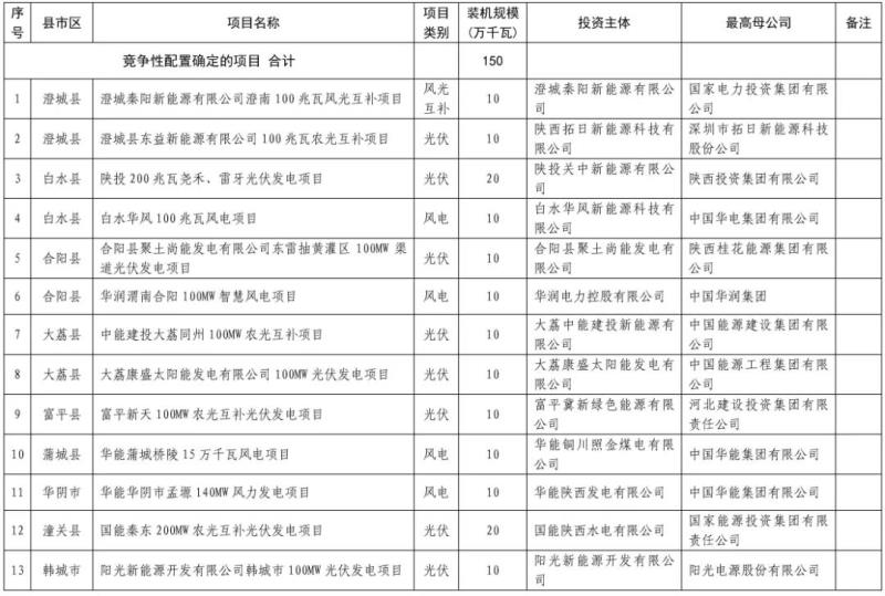 其余150萬千瓦新能源項目通過競爭性配置確定項目開發(fā)業(yè)主。其中,13個項目150萬千瓦納入渭南市新能源基地,包括:風電4個共40萬千瓦,光伏8個共100萬千瓦,風光互補1個共10萬千瓦。