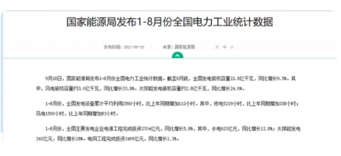 據(jù)國(guó)家能源局消息,9月18日,國(guó)家能源局發(fā)布1-8月份全國(guó)電力工業(yè)統(tǒng)計(jì)數(shù)據(jù)。截至8月底,全國(guó)發(fā)電裝機(jī)容量22.8億千瓦,同比增長(zhǎng)9.5%。其中,風(fēng)電裝機(jī)容量約3.0億千瓦,同比增長(zhǎng)33.8%。太陽(yáng)能發(fā)電裝機(jī)容量約2.8億千瓦,同比增長(zhǎng)24.6%。