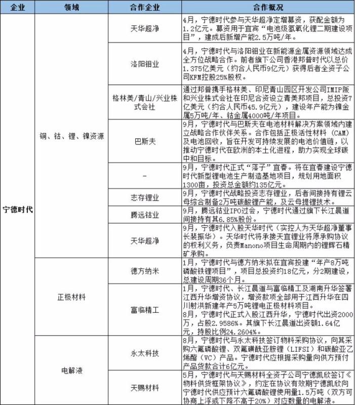 據(jù)不完全統(tǒng)計(jì),寧德時(shí)代直接或間接參股的上游材料企業(yè)超過20家,通過控股、兼并購、深度綁定以加深對(duì)鋰電池上游原材料的掌控。