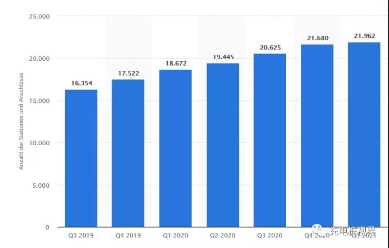 據(jù)統(tǒng)計(jì),截止2021年第一季度,德國(guó)約有21962個(gè)充電樁。由于每個(gè)充電樁通常配備多個(gè)充電接口,因此,粗略計(jì)算全德總計(jì)目前約有超過6萬個(gè)充電點(diǎn)。