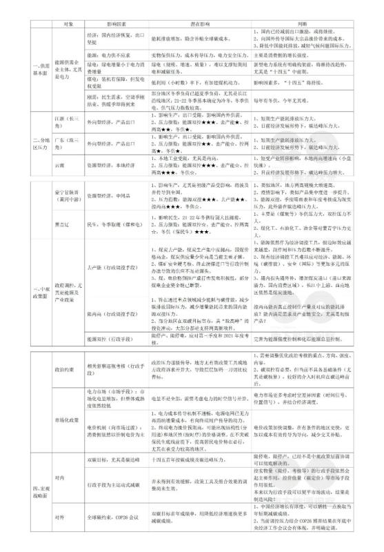 綜上,區(qū)域差異方面,各地壓力指數(shù)不同,冬季保供(電、煤、氣)、去產(chǎn)能、控兩高、能源雙控及組合效果對各地影響差異較大??傮w上,江浙、廣東、內(nèi)蒙等地壓力更大;能源雙控是既有政策,主要作用于消費(fèi)側(cè),總體影響較去產(chǎn)能低,東北三省、湘鄂贛渝等地的電、煤冬季保供壓力較大。