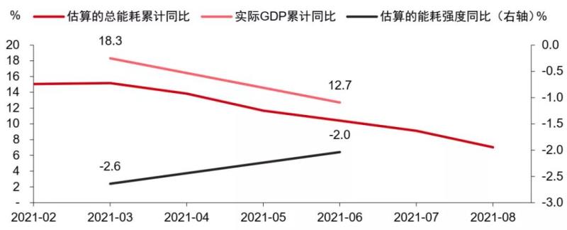 2021年全國能耗控制形勢不容樂觀,呈現(xiàn)總量上升、效率下降趨勢。據(jù)中信證券的測算,總能耗增速下降,但總量仍在增加,能耗強(qiáng)度下降率呈衰減趨勢。2021年前8個(gè)月,全國電力能耗、鋼鐵能耗、水泥能耗三項(xiàng)占全國能耗的60%以上,這三個(gè)部門是影響年內(nèi)能耗與碳排放控制目標(biāo)的關(guān)鍵。