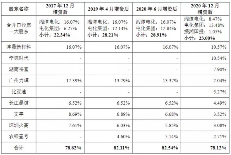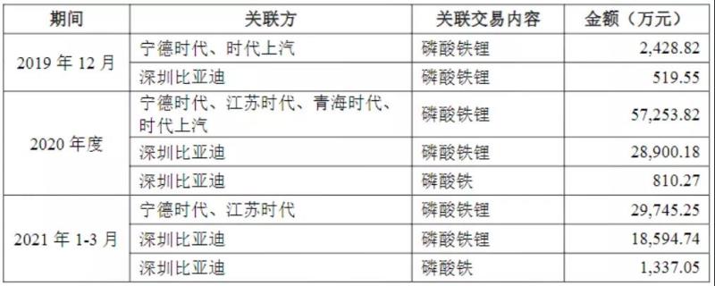 2020年12月,湖南裕能增資擴股并引入了主要客戶寧德時代、比亞迪作為戰(zhàn)略投資者入股,后者分別持有湖南裕能10.54%、5.27%股權(quán)。此外,寧德時代通過旗下寧波問鼎出資間接參股長江晨道,而長江晨道自2017年起多次參與增資湖南裕能,合計持有4.49%股權(quán)。