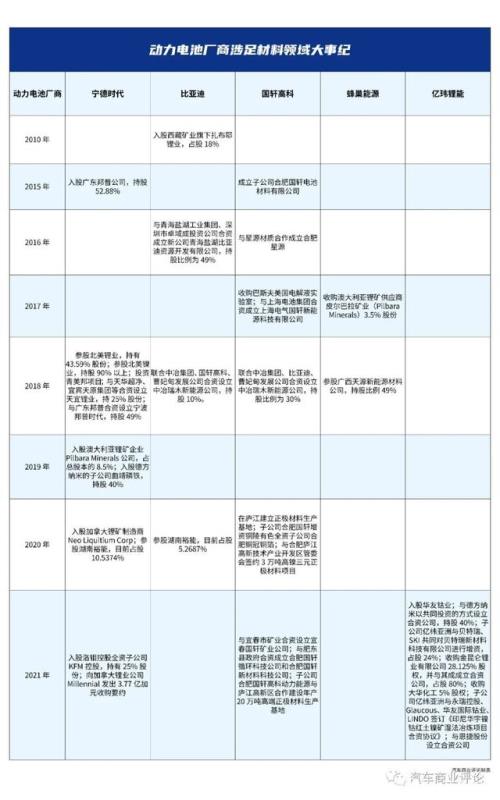 很多電池制造企業(yè),除了與上游的礦業(yè)和中游的材料公司建立牢固、長久、穩(wěn)定的合作關(guān)系,更是利用資本深入上游產(chǎn)業(yè)鏈之中?;蚴侵苯涌刂频V產(chǎn)資源,或是參股材料生產(chǎn)企業(yè),或是建立合資材料公司,甚至自建材料工廠。