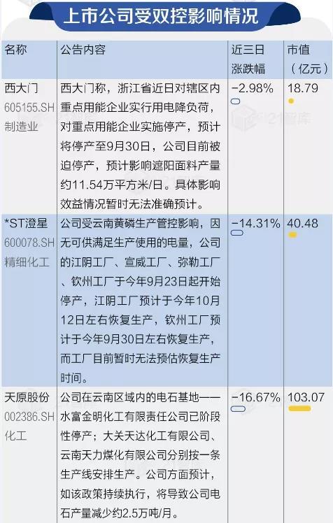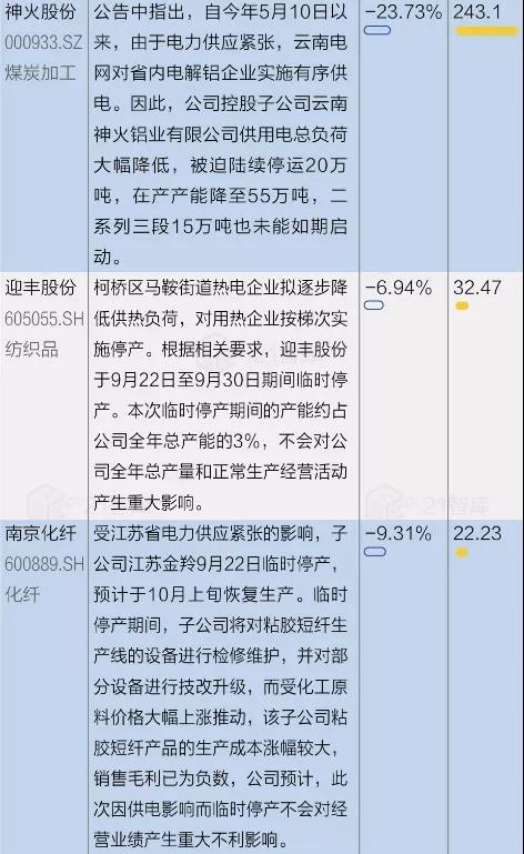 各行業(yè)的數(shù)十家上市公司紛紛公告停產(chǎn)、限產(chǎn)消息。據(jù)21世紀(jì)經(jīng)濟報道新能源課題組不完全統(tǒng)計,截至9月27日,已有23家上市公司發(fā)布了限電停產(chǎn)相關(guān)公告。最先宣布受到影響的,是廣西的陶瓷生產(chǎn)企業(yè)蒙娜麗莎(002918.SZ)。