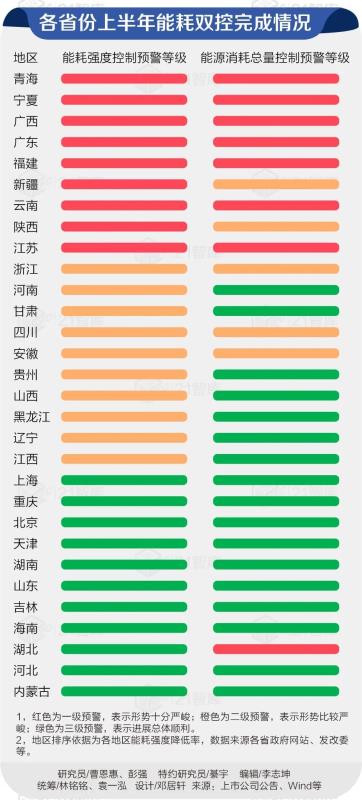 據(jù)中金公司研究部測算,上半年能耗強度不達(dá)標(biāo)的省份,合計占到中國工業(yè)增加值的70%左右,其中紅色預(yù)警和黃色預(yù)警的省份,分別占比約38%和32%。