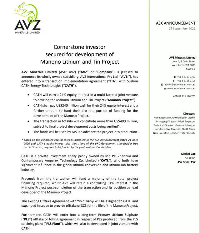 澳大利亞礦產(chǎn)勘探公司AVZ Minerals(ASX:AVZ)于當(dāng)?shù)貢r(shí)間9月27日宣布,該公司已經(jīng)與中企蘇州天華時(shí)代新能源產(chǎn)業(yè)投資公司(下稱天華時(shí)代)達(dá)成協(xié)議,獲得天華時(shí)代2.4億美元(約合人民幣15億元)的注資后,將用于開發(fā)位于剛果(金)的鋰項(xiàng)目Manono,天華時(shí)代將獲得該項(xiàng)目公司24%股權(quán)。澳企AVZ透露,在開發(fā)成本核實(shí)后,寧德時(shí)代提供的資金將超4億美元(約合人民幣25.8億元)。此外,兩家公司或?qū)⒗^續(xù)合作,評(píng)估開發(fā)氫氧化鋰設(shè)施的可行性。