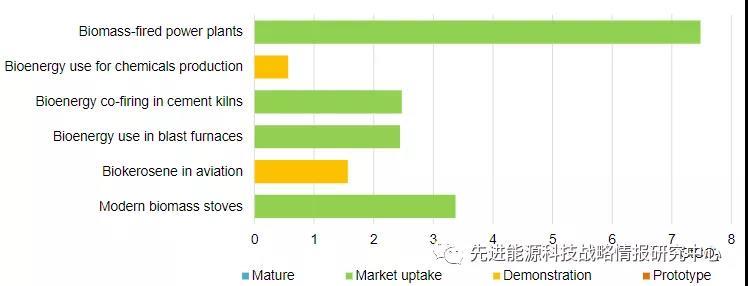 圖5 APS情景中2020-2060年間不同成熟度的生物能源技術為中國貢獻的累計碳減排量(單位:十億噸CO2)