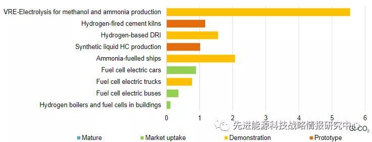 (1)氫能相關技術中,90%的碳減排貢獻來自處于原型和示范階段的技術
