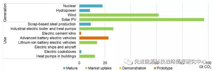 圖2 APS情景中2020-2060年間不同成熟度的電氣化技術為中國貢獻的累計碳減排量(單位:十億噸CO2)