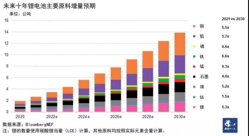 根據(jù)BloombergNEF的預(yù)期,此前最容易引起電池行業(yè)緊張的鈷元素,因為低鈷和無鈷電池技術(shù)的發(fā)展,未來十年的需求量增幅將僅有50%,銅、鋁、鋰、鎳等元素的增幅為4倍多,磷、貼、錳的需求增幅更大,達到5倍以上。但總體上各類原材料并不存在致命的短缺。