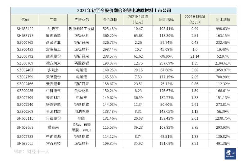 上游企業(yè)就不存在這種不確定性,原材料是高度標準化的工業(yè)品,只要整個市場有增量,那就一定能兌現(xiàn)為每個企業(yè)的發(fā)展壯大,這是資本市場更看好上游企業(yè)的主要原因。從年初至今,原材料和制造設(shè)備領(lǐng)域,就有17家上市公司的股價增長超過100%,這些公司的普遍特征是,2021年上半年的利潤同比增幅遠超營收增幅。
