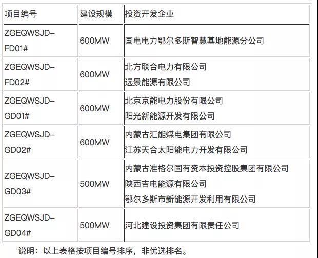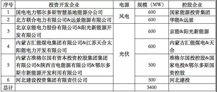 根據(jù)優(yōu)選結(jié)果來(lái)看,中標(biāo)企業(yè)多數(shù)以聯(lián)合體形式中標(biāo),國(guó)家能源投資集團(tuán)、華能&遠(yuǎn)景各拿下600MW的風(fēng)電項(xiàng)目。京能&陽(yáng)光新能源、內(nèi)蒙古匯能煤電&天合各中標(biāo)600MW的光伏項(xiàng)目,準(zhǔn)格爾國(guó)投&國(guó)家電投&鄂爾多斯國(guó)投、河北建投則各中標(biāo)500MW的光伏項(xiàng)目。具體結(jié)果見(jiàn)下: