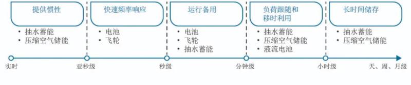 在最小的響應(yīng)時(shí)間等級(jí)(亞秒級(jí))層面上,特定的儲(chǔ)能技術(shù),比如抽水蓄能,可以提供慣性并提供甩負(fù)荷情況下的第一道保護(hù),降低電網(wǎng)對(duì)熱力發(fā)電調(diào)頻的依賴。從亞秒級(jí)到秒級(jí),電力儲(chǔ)能(大部分是電池,但在一些應(yīng)用中還有飛輪)能夠提供快速頻率響應(yīng),這也是目前一些電力系統(tǒng)正在實(shí)施的方案。在秒級(jí)到分鐘級(jí)的層面,儲(chǔ)能主要用于提供調(diào)頻備用(主要是電池、飛輪和抽水蓄能)。在分鐘級(jí)到小時(shí)級(jí)上,抽水蓄能、CAES和液流電池可用于負(fù)荷跟隨和能源移時(shí)利用。在小時(shí)級(jí)到天級(jí)、星期級(jí)甚至月級(jí)以上,電力儲(chǔ)能可以長(zhǎng)期儲(chǔ)存電量[7],這在VRE并網(wǎng)時(shí)是必要的(圖4)。
