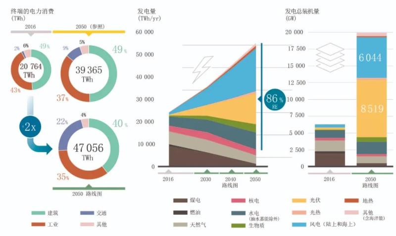 注:IRENA的路線圖情景包括了低碳技術(shù)的應(yīng)用,主要是可再生能源和能效提升,來(lái)實(shí)現(xiàn)全球能源系統(tǒng)的轉(zhuǎn)型以達(dá)到全球溫升2℃的控制目標(biāo)。該評(píng)估考慮了可再生能源的潛能的所有潛能,與各國(guó)專家共同開(kāi)展了各國(guó)的分析,然后,將這些結(jié)果整合起來(lái)獲得全球的結(jié)果。