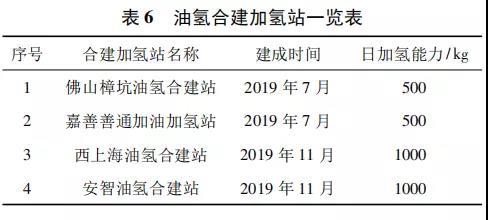 近年來(lái),各地相繼出臺(tái)氫能產(chǎn)業(yè)規(guī)劃,氫能基礎(chǔ)設(shè)施建 設(shè) 呈 現(xiàn) 迅 猛 發(fā) 展 態(tài) 勢(shì)[26]。截 至 2020 年 1 月,中國(guó)已建成加氫站 61 座,其中建成油氫合建站 4 座( 詳見表 6) 。據(jù)不完全統(tǒng)計(jì),2020 年底將建成超過 100 座加氫站,其中大部分是油氫合建站、氣氫合建站或油電氫合建站等。在眾多合建站類型中,油氫合建站被認(rèn)為是最具發(fā)展?jié)摿Φ哪茉醇幼⒄尽?