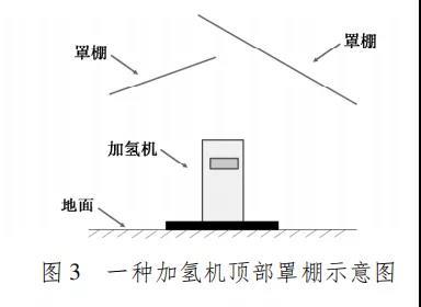 (2) 加氫機(jī)頂部罩棚一方面是為加氫機(jī)遮雨、避免陽(yáng)光長(zhǎng)時(shí)間照射,另一方面也是為氫氣加注操作人員、加氫用戶提供一個(gè)相對(duì)舒適的環(huán)境。罩棚設(shè)置必須滿足氫氣不積聚的要求,不應(yīng)該限制罩棚的具體坡向形式。如圖 3 所示,罩棚坡向內(nèi)側(cè),也不會(huì)積聚氫氣。