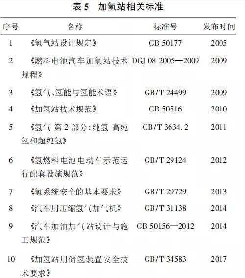 表5 列出了部分氫能及加氫站相關(guān)標(biāo)準(zhǔn)。2005 年國(guó)家建設(shè)部和質(zhì)監(jiān)局聯(lián)合頒布了升級(jí)的《氫氣站設(shè)計(jì)規(guī)定》GB 50177—2005,對(duì)國(guó)內(nèi)新建、改建、擴(kuò)建氫氣站、供氫站及廠區(qū)設(shè)計(jì)提供依據(jù); 2010 年國(guó)家建設(shè)部和質(zhì)監(jiān)局再次聯(lián)合頒布了《加氫站技術(shù)規(guī)范》GB 50516—2010,對(duì)國(guó)內(nèi)加氫站設(shè)計(jì)、建設(shè)起到了積極的指導(dǎo)作用。2019 年 8 月國(guó)家住房和城鄉(xiāng)建設(shè)部委托中國(guó)石化集團(tuán)公司主持修編《汽車加油加氣站設(shè)計(jì)與施工規(guī)范》,修訂的主要內(nèi)容之一是增加油氫合建加氫站的技術(shù)要求,以適應(yīng)氫燃料電池汽車的發(fā)展。2020 年 6 月 12 日住房和城鄉(xiāng)建設(shè)部公布了《汽車加油加氣加氫站技術(shù)標(biāo)準(zhǔn)( 征求意見稿) 》《加氫站技術(shù)規(guī)范( 局部修訂條文征求意見稿) 》,征求意見稿分別對(duì)原標(biāo)準(zhǔn)進(jìn)行了局部的修編和內(nèi)容補(bǔ)充。