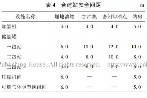 為確保加氫站的安全穩(wěn)定運(yùn)行,不論是在加氫站選址、設(shè)備布局、工藝及工程設(shè)計(jì)階段,還是設(shè)備選型、施工、驗(yàn)收、運(yùn)營(yíng)過程,都必須嚴(yán)格按照相關(guān)標(biāo)準(zhǔn)和規(guī)范開展工作。如: 指導(dǎo)加氫站設(shè)計(jì)的《加氫站技術(shù)規(guī)范》GB 50516—2010、《加氫站安全技術(shù)規(guī)范》GB /T 34584—2017 等。GB 50516—2010 對(duì)站址選擇、總平面布置、安全間距、加氫工藝與設(shè)施、消防與安全設(shè)施、建筑設(shè)施、給排水、電氣裝置、施工安裝驗(yàn)收及運(yùn)營(yíng)管理等方面做了明確的規(guī)定。合建站內(nèi)加氫機(jī)、儲(chǔ)氫罐、壓縮機(jī)間、可燃?xì)怏w調(diào)節(jié)閥組間與加油站內(nèi)埋地油罐、加油機(jī)、密閉卸油點(diǎn)、站房的間距見表 4。國(guó)外加氫站工藝設(shè)備布置緊湊,與國(guó)外同類型加氫站安全間距相比,我國(guó)規(guī)范的安全間距仍有縮減的空間,從而利于用地布局。