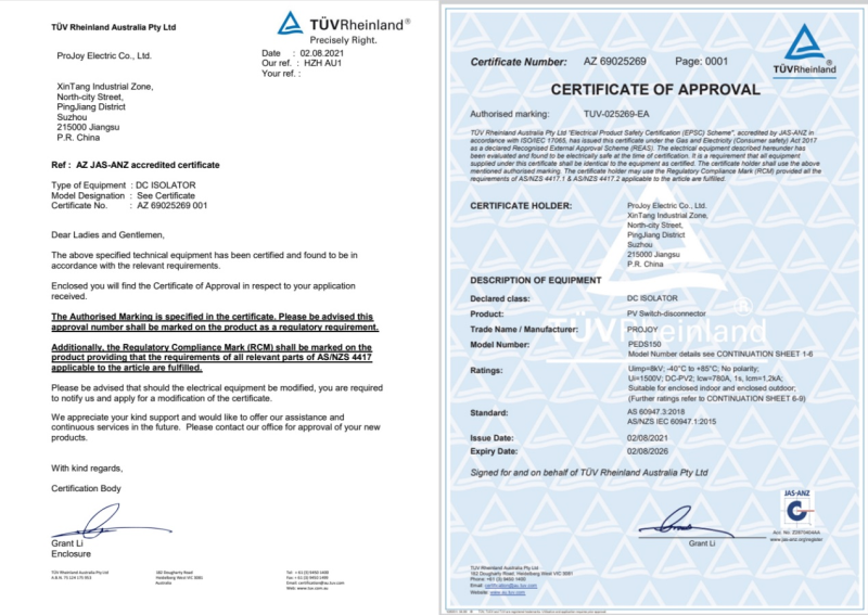 早在8月初,蘇州普兆新能源設(shè)備有限公司(簡(jiǎn)稱“普兆”)PEDS16-55A( 300V~1500V)全部系列直流隔離開(kāi)關(guān)通過(guò)澳大利亞AS 60947.3:2018和 AS/NZS IEC 60947.1:2015標(biāo)準(zhǔn)測(cè)試,率先獲得TüV萊茵澳大利亞本土認(rèn)證,這是國(guó)內(nèi)首家獲得澳洲本土認(rèn)證的隔離開(kāi)關(guān)品牌!