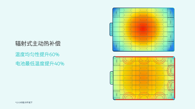 其三,輻射式主動(dòng)熱補(bǔ)償。如果車輛長(zhǎng)時(shí)間處在低溫環(huán)境下,電池包會(huì)主動(dòng)開啟輻射加熱系統(tǒng),均勻加熱電芯,確保電池包快速到底最優(yōu)的工作溫度,同時(shí)兼顧能耗。根據(jù)測(cè)試,12小時(shí)極冷環(huán)境下,電池的最低溫度能夠提升40%,溫度均勻性可以提升60%。