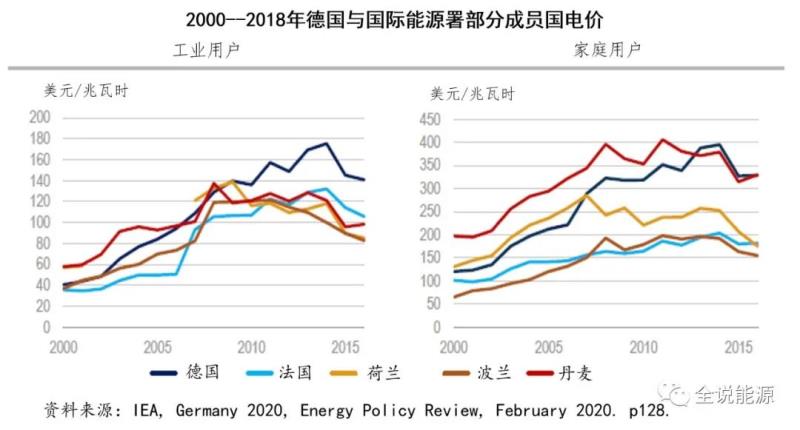 我們知道的是,為了推進(jìn)能源轉(zhuǎn)型,德國(guó)花費(fèi)了巨額的財(cái)政支出,其中自2000年以來,德國(guó)在能源轉(zhuǎn)型過程中的稅收減免和可再生能源補(bǔ)貼總支出就超過了2430億歐元。羊毛當(dāng)然是出在羊身上,這些巨額的財(cái)政支出最終都轉(zhuǎn)嫁給了德國(guó)的普通百姓。因?yàn)檎鞫?、收費(fèi)和稅收,包括用于支付可再生能源補(bǔ)貼的稅收,德國(guó)消費(fèi)者支付的電價(jià)在國(guó)際能源署成員國(guó)中是最高的。2018年,盡管能源密集型行業(yè)的價(jià)格大幅下降,但德國(guó)在國(guó)際能源署成員國(guó)中工業(yè)電價(jià)排名第三,其中稅收占整個(gè)工業(yè)電價(jià)的48%,是國(guó)際能源署成員國(guó)中最高的;家庭用戶支付的總電價(jià)中,大約一半是公共費(fèi)用,僅次于丹麥,排名第二。