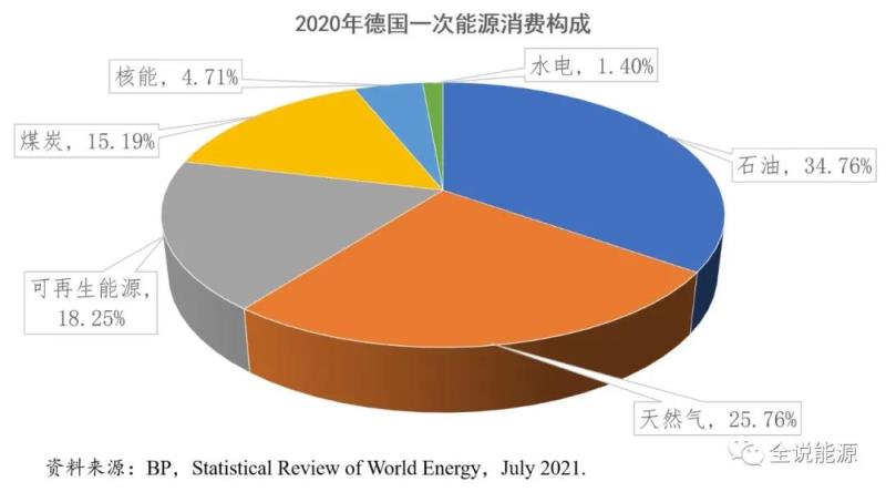 具體細(xì)分,德國(guó)的能源消費(fèi)高度依賴傳統(tǒng)的化石能源。2020年,德國(guó)一次能源消費(fèi)結(jié)構(gòu)中,石油是第一大能源來源,占比34.76%;天然氣第二,占比25.76%;可再生能源第三,占比18.25%;煤炭第四,占比15.19%;核能第五,占比4.71%;水電第六,占比1.4%。