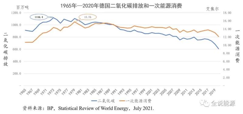 從統(tǒng)計(jì)數(shù)字看,德國(guó)能源消費(fèi)產(chǎn)生的二氧化碳排放量最高的年份,是49年前的1973年,為11.164億噸,自此之后就再也沒有超過這個(gè)數(shù)字。因此,可以說,早在約50年前德國(guó)就已經(jīng)實(shí)現(xiàn)了碳達(dá)峰,德國(guó)能源消費(fèi)的二氧化碳達(dá)峰,與后來逐漸大熱的氣候問題和減排,沒有任何直接的關(guān)系。