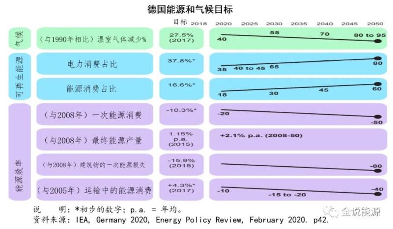綜合上述有關(guān)文件,為了實(shí)現(xiàn)能源轉(zhuǎn)型,德國(guó)政府計(jì)劃,以2008年為基準(zhǔn),2020年德國(guó)一次能源消費(fèi)要下降20%,2050年要下降50%;以1990年為基準(zhǔn),2020年德國(guó)溫室氣體排放要下降40%,2030年要下降55%,2050年要下降80-95%;來源于可再生能源的發(fā)電,2020年至少要達(dá)到35%,2030年要達(dá)到50%,2040年要達(dá)到65%,2050年要達(dá)到80%。