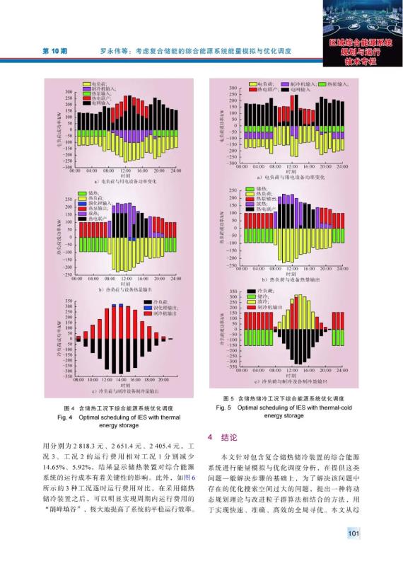 結(jié)論:本文針對包含復(fù)合儲熱儲冷裝置的綜合能源系統(tǒng)進行能量模擬與優(yōu)化調(diào)度分析,在提供這類問題一般解決步驟的基礎(chǔ)上,為了解決該問題中存在的優(yōu)化搜索空間過大的問題,提出一種將動態(tài)規(guī)劃理論與改進粒子群算法相結(jié)合的方法,用于實現(xiàn)快速、準確、高效的全局尋優(yōu)。本文從綜合能源系統(tǒng)負荷預(yù)測分析、能源供應(yīng)系統(tǒng)設(shè)計及使用調(diào)度等方面出發(fā),將提出的相關(guān)算法對包含不同儲能工況的綜合能源系統(tǒng)進行仿真與對比分析。結(jié)果表明,儲熱裝置對綜合能源系統(tǒng)的運行成本有著關(guān)鍵性的影響,儲能裝置充放能的調(diào)度直接影響著整體運行費用,模擬工況3、工況2的運行費用相對工況1分別減少14.65%、5.92%,此外,在采用儲熱儲冷裝置之后,可以明顯實現(xiàn)周期內(nèi)運行費用的“削峰填谷”,極大地提高了系統(tǒng)的平穩(wěn)運行效率,可減少不必要的供能設(shè)備使用,不僅減少了系統(tǒng)運行成本,也提高了能源利用效率。
