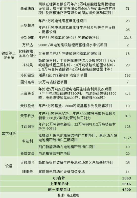 為滿足不斷增長的產(chǎn)能需求,國內(nèi)鋰電產(chǎn)業(yè)鏈企業(yè)開足馬力,今年7-9月,國內(nèi)鋰電材料/設(shè)備領(lǐng)域擴產(chǎn)項目達57起,總投資金額達1863億元。