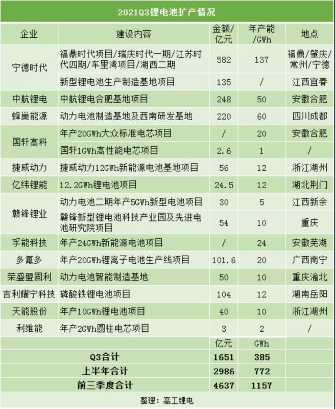 高工鋰電不完全統(tǒng)計,2021年Q3,寧德時代、中航鋰電、蜂巢能源、國軒高科、億緯鋰能等十余家企業(yè)相繼宣布投建鋰電池項目,合計新增鋰電池規(guī)劃產(chǎn)能385GWh,已公布的總投資金額約1650億元。