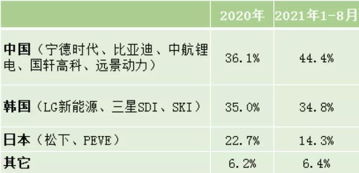 最新數(shù)據(jù)統(tǒng)計,今年1-8月,國內(nèi)寧德時代、比亞迪、中航鋰電、國軒高科、遠景動力的全球動力電池裝機合計市場份額從去年的36.1%提升至44.4%,而以松下、LG新能源、三星SDI和SKI為代表的日韓市場份額已有所下滑。