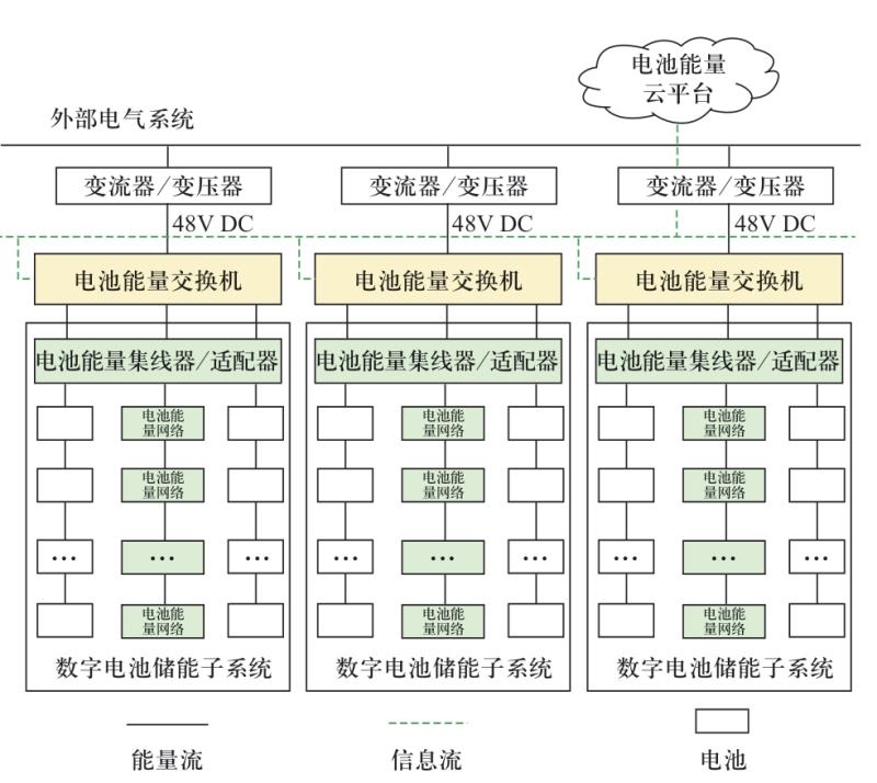 數(shù)字儲能系統(tǒng)應用示范方案采用動態(tài)重構拓撲管理的能量交換機電池管理方案,方案中包括電池能量網(wǎng)卡、電池能量集線器、電池能量交換機、電池能量適配器、以及云平臺(巡檢云平臺及調(diào)度云平臺)及通信信道等,構建能量流、信息流統(tǒng)一收集、傳輸、處理及控制的分布式儲能管控系統(tǒng)[25],整體架構如圖5所示。