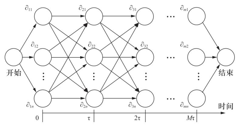 有向無環(huán)圖中的每一個點代表可能的電池網(wǎng)絡拓撲,由現(xiàn)在電池拓撲狀態(tài)選擇為下一個電池網(wǎng)絡拓撲狀態(tài)所產(chǎn)生的電池性能損耗為邊的權重。在T個拓撲變換周期內(nèi),儲能系統(tǒng)在連續(xù)運行過程中電池網(wǎng)絡拓撲變換控制策略可執(zhí)行為尋找有向無環(huán)圖中最短加權路徑。