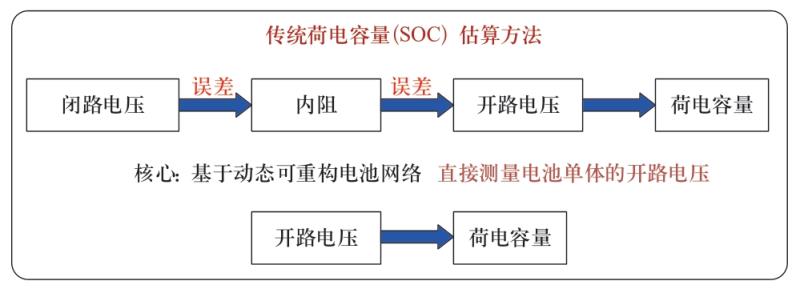 目前文獻中已經(jīng)有多種SOC估算方法,包括應用最廣泛的安時積分法、開路電壓(open circuit voltage,OCV)與SOC映射法等,均依賴于電流或電壓的測量精度并受到電池非線性特性影響,其估算方法的精度受到質(zhì)疑。其中,SOC-OCV映射法是業(yè)界公認的最簡單、最精確的電池SOC估算方法,但是傳統(tǒng)固定串/并聯(lián)電池系統(tǒng)無法在電池系統(tǒng)充放電過程中動態(tài)實時測量電池單體的OCV,因此傳統(tǒng)固定拓撲連接的電池系統(tǒng)無法直接利用電池單體層面的OCV-SOC的一一對應關系,只能通過測量工作電壓和電流推算電池內(nèi)阻,進而通過內(nèi)阻估算值進一步估算OCV,然后得到當前的SOC,過程中將引入兩次估算誤差傳遞,導致最終得到的結果誤差過大,嚴重影響了實際系統(tǒng)的用戶體驗和系統(tǒng)能量控制精度。圖2為基于重構電池網(wǎng)絡SOC估計原理示意圖。