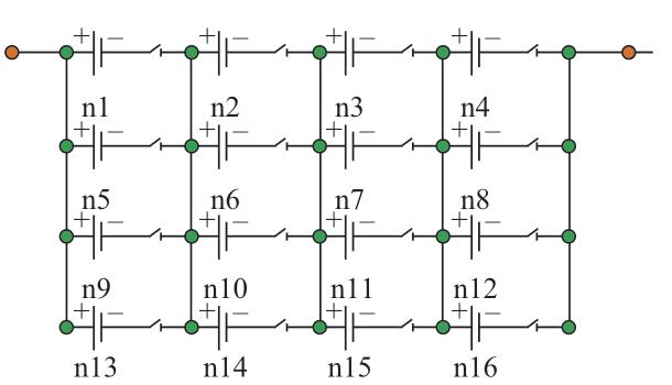 文獻[13]研究可重構電池網(wǎng)絡理論,完成基于26650鋰離子電池單體樣機研制,該系統(tǒng)構成4并4串的可重構電池模組,其可重構電池網(wǎng)絡的設計如圖1所示。電池儲能系統(tǒng)構建12 V低壓直流數(shù)據(jù)中心不間斷供電系統(tǒng),結合圖論的優(yōu)化配置方法生成電池均衡管理與可重構策略[26]。