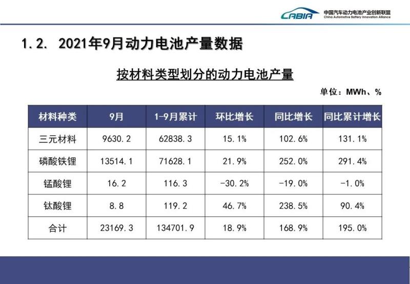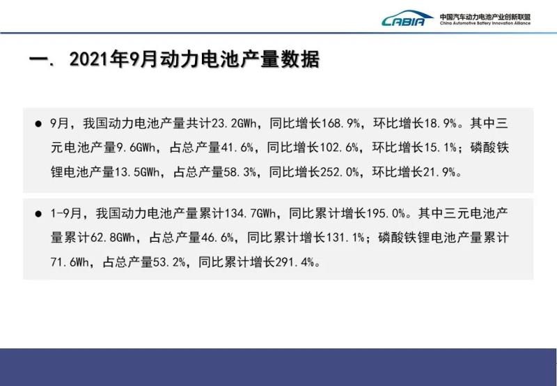 產量方面,2021年9月,我國動力電池產量共計23.2GWh,同比增長168.9%,環(huán)比增長18.9%。其中三元電池產量9.6GWh,占總產量41.6%,同比增長102.6%,環(huán)比增長15.1%;磷酸鐵鋰電池產量13.5GWh,占總產量58.3%,同比增長252.0%,環(huán)比增長21.9%。l1-9月,我國動力電池產量累計134.7GWh,同比累計增長195.0%。其中三元電池產量累計62.8GWh,占總產量46.6%,同比累計增長131.1%;磷酸鐵鋰電池產量累計71.6Wh,占總產量53.2%,同比累計增長291.4%。