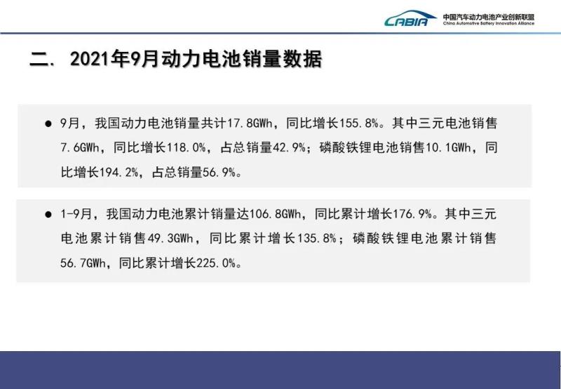 銷量方面:2021年9月,我國動力電池銷量共計17.8GWh,同比增長155.8%。其中三元電池銷售7.6GWh,同比增長118.0%,占總銷量42.9%;磷酸鐵鋰電池銷售10.1GWh,同比增長194.2%,占總銷量56.9%。1-9月,我國動力電池累計銷量達106.8GWh,同比累計增長176.9%。其中三元電池累計銷售49.3GWh,同比累計增長135.8%;磷酸鐵鋰電池累計銷售56.7GWh,同比累計增長225.0%。