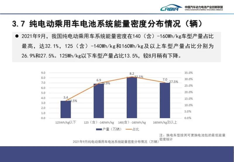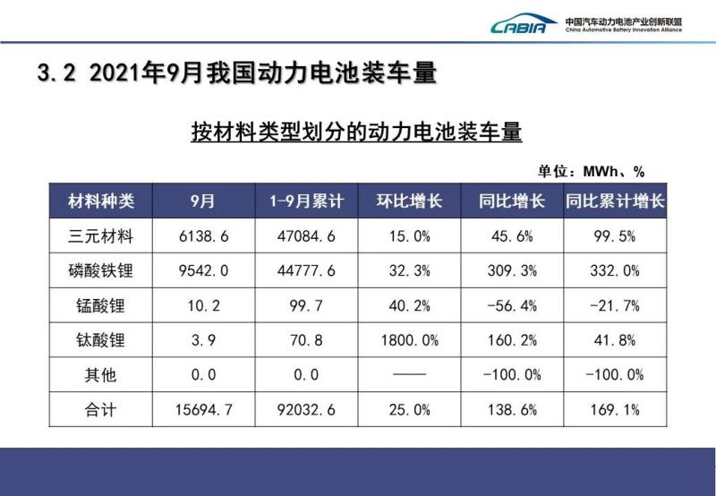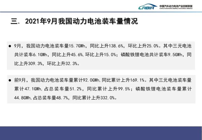 裝車量方面,2021年9月,我國動力電池裝車量15.7GWh,同比上升138.6%,環(huán)比上升25.0%。其中三元電池共計裝車6.1GWh,同比上升45.6%,環(huán)比上升15.0%;磷酸鐵鋰電池共計裝車9.5GWh,同比上升309.3%,環(huán)比上升32.3%。1-9月,我國動力電池裝車量累計92.0GWh,同比累計上升169.1%。其中三元電池裝車量累計47.1GWh,占總裝車量51.2%,同比累計上升99.5%;磷酸鐵鋰電池裝車量累計44.8GWh,占總裝車量48.7%,同比累計上升332.0%。