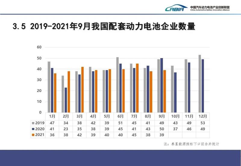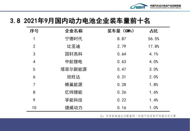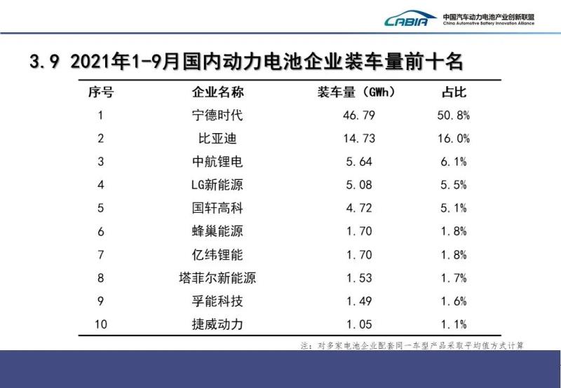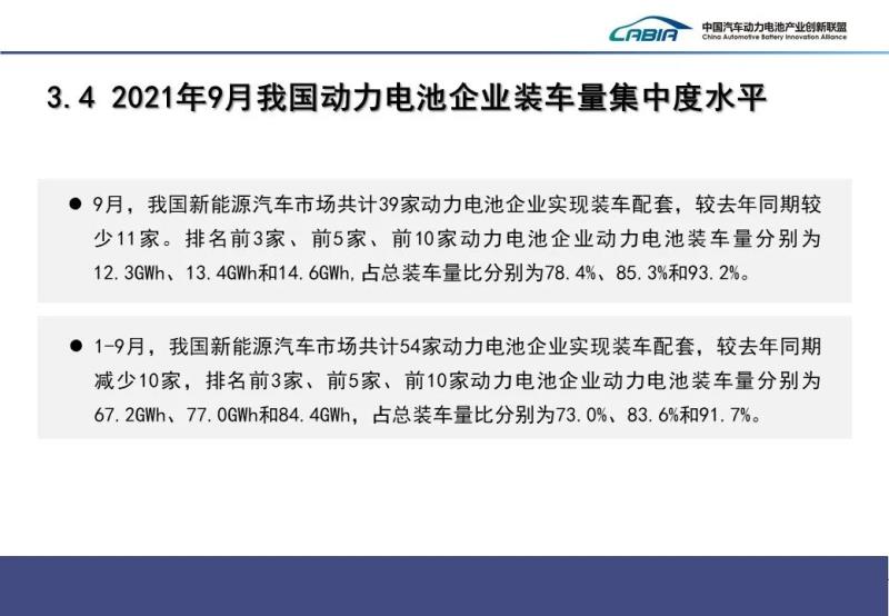 2021年9月,我國新能源汽車市場共計39家動力電池企業(yè)實現(xiàn)裝車配套,較去年同期較少11家。排名前3家、前5家、前10家動力電池企業(yè)動力電池裝車量分別為12.3GWh、13.4GWh和14.6GWh,占總裝車量比分別為78.4%、85.3%和93.2%。1-9月,我國新能源汽車市場共計54家動力電池企業(yè)實現(xiàn)裝車配套,較去年同期減少10家,排名前3家、前5家、前10家動力電池企業(yè)動力電池裝車量分別為67.2GWh、77.0GWh和84.4GWh,占總裝車量比分別為73.0%、83.6%和91.7%。