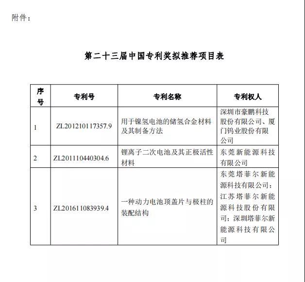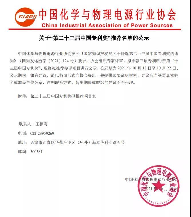中國化學與物理電源行業(yè)協(xié)會按照《國家知識產權局關于評選第二十三屆中國專利獎的通知》(國知發(fā)運函字〔2021〕124號)要求,協(xié)會組織專家評審,擬推薦三項專利申報“第二十三屆中國專利獎”。現(xiàn)將擬推薦參評項目進行公示,公示期為2021年10月18日至10月22日。公示期內,如有異議,請以書面形式向協(xié)會提出,并提供必要證明材料,異議應當簽署真實姓名或加蓋單位公章,注明聯(lián)系方式。超出期限或匿名的異議不予受理。