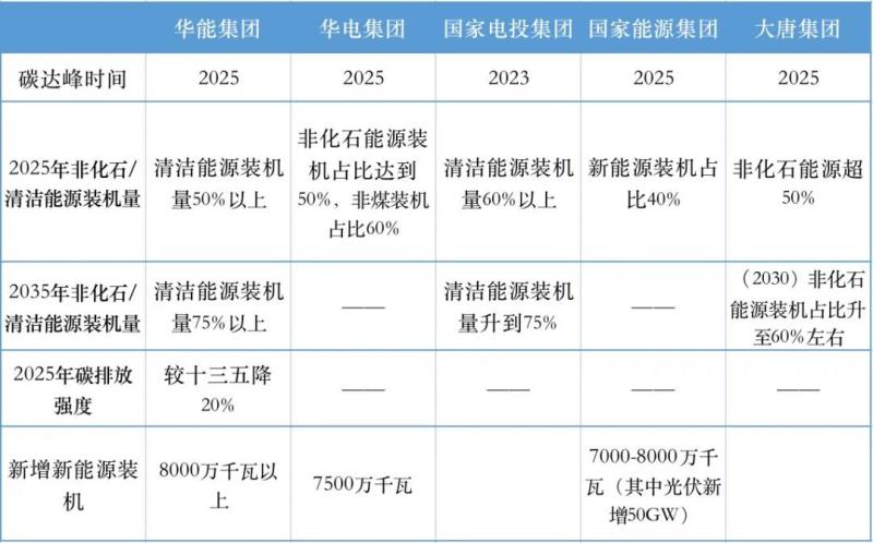 實際上,在習近平主席提出“3060”目標后,2020年年底開始,五大發(fā)電集團相繼提出了集團的碳達峰時間表、清潔能源裝機量和新增裝機等目標。