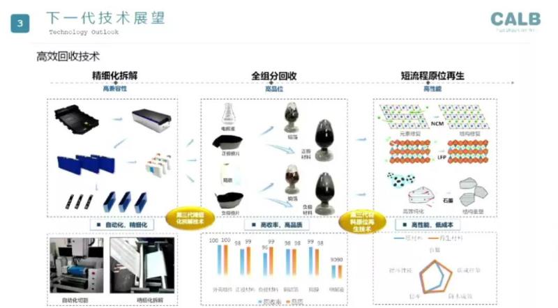 謝秋認為,目前回收技術算是第三代技術,一代很野蠻暴力的燒;第二代是破碎,把電池丟進去;第三代,中航鋰電希望做精細化、自動化拆解,將銅箔、鋁箔、正極、負極材料完整地分離出來,這樣效率上會高很多,然后進行短流程的原位再生。